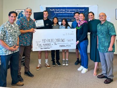 Congratulations to Mid-Pacific's Cyber Owls for winning first place at the inaugural Pacific Technology Cooperation Group's "Cyber Forensics Five-0 Challenge" at the end of January. The challenge pit the top Hawai`i cybersecurity high school teams against one another to solve real-world cyber threats. The competition organizers and sponsors Peraton and Pacific Technology Cooperation Group representatives - Kapu Solutions, Ikaika Global Strategic Solutions, and Ho`opili Technology presented the team with a $500 donation and unique United States Army coin. Way to go, Cyber Owls team!
